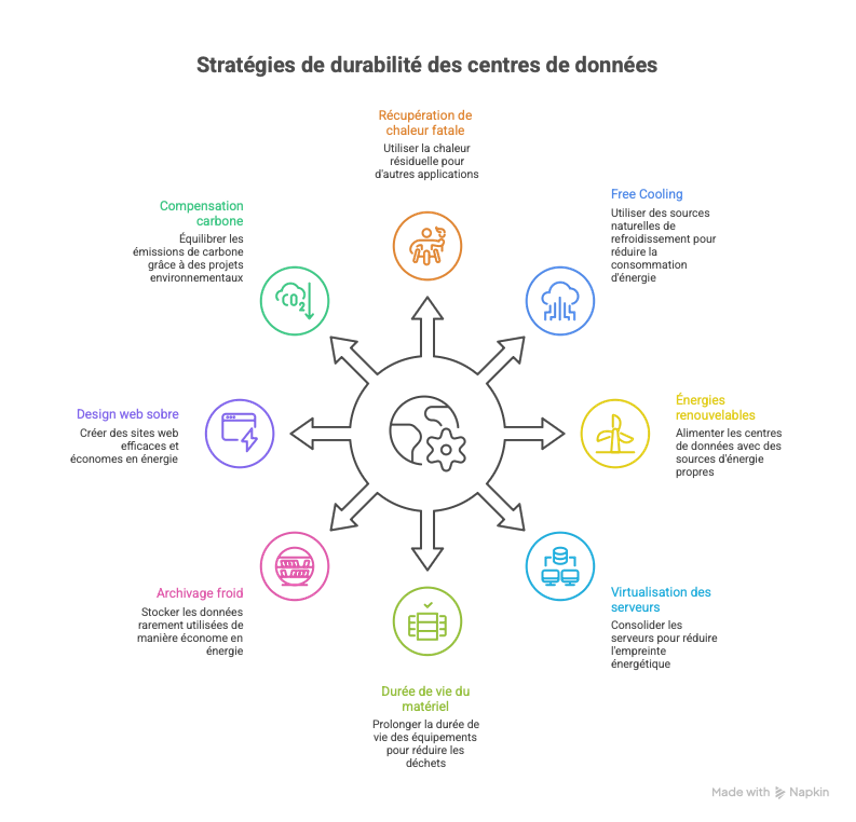 - Free Cooling : utilisation de l’air extérieur frais pour refroidir les salles serveurs, réduisant l’usage des climatiseurs.